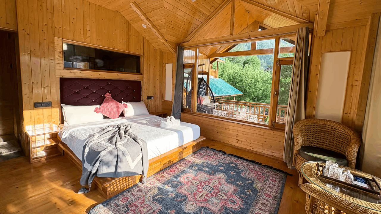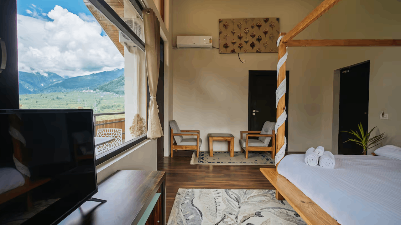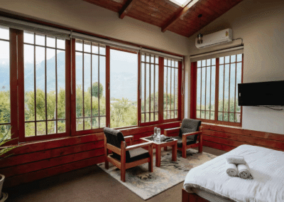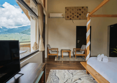 Each room features a plush king-size bed with its unique decor. Two rooms have private balconies with a spectacular panoramic view of surrounding landscape, out of which one room has a bathtub. The rooms receive ample sunlight, which keeps the rooms cozy during winters. All the rooms are equipped with hot and cold air-conditioners and electric blankets (on request).