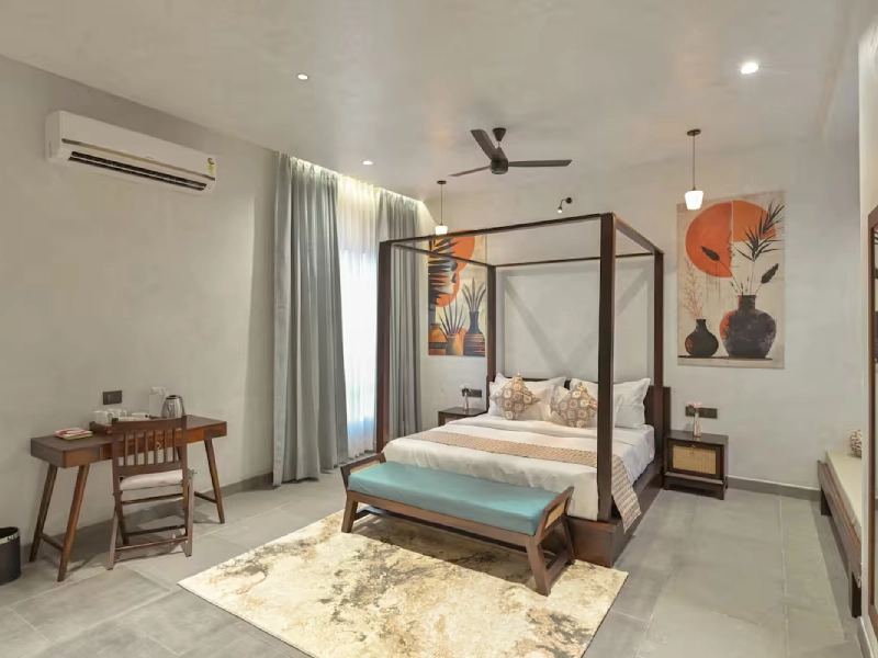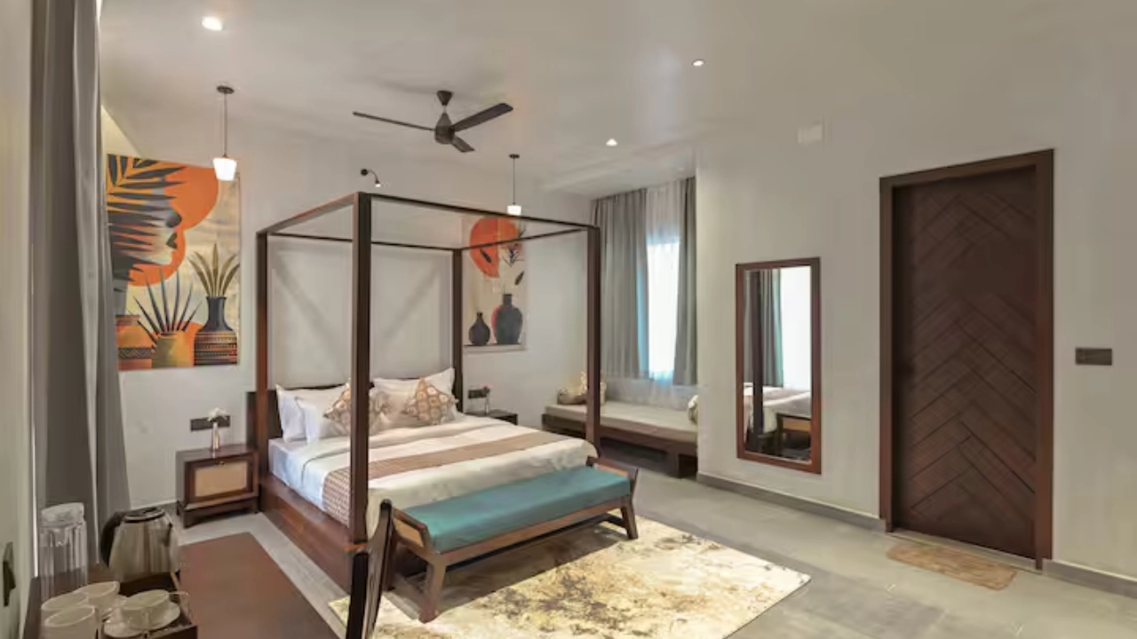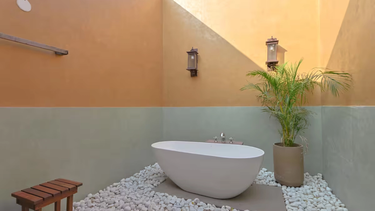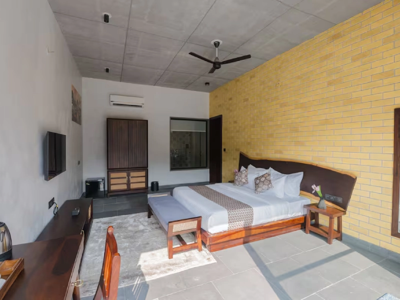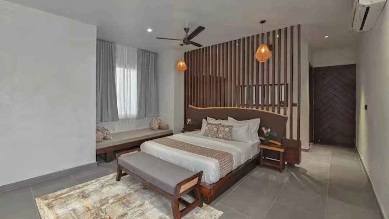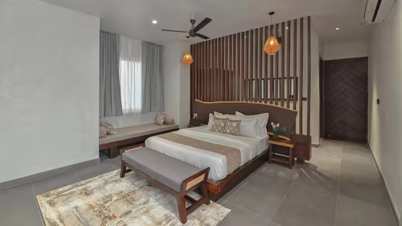 This spacious 2-BR villa is designed to offer privacy & earthy luxury. Both bedrooms feature a king-size bed, soft linens and handcrafted woodwork. Large windows allow natural light, creating a bright & airy atmosphere. Each bedroom includes an attached bathroom. One bathroom features a large soaking bathtub with a separate shower area. The highlight of the unit is a private plunge pool, which the villa opens directly into. This combo is perfect for a group of 4.