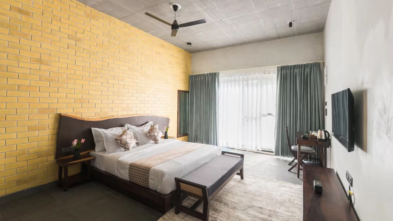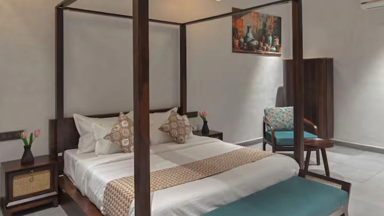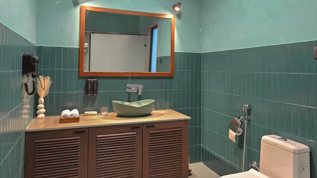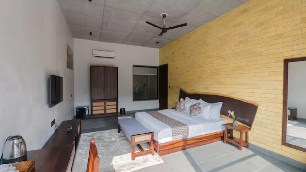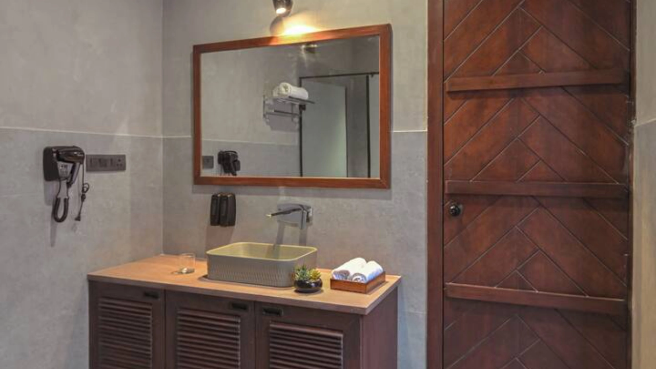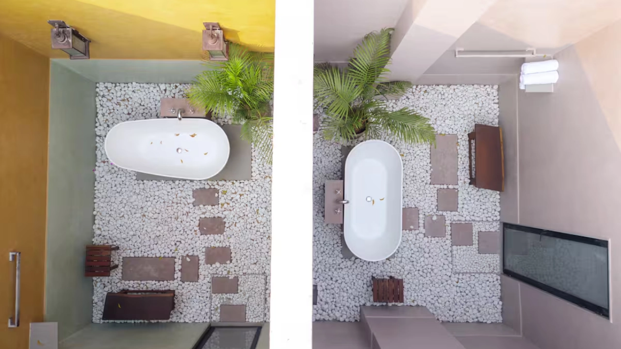 This spacious 2-BR villa is designed to offer privacy & earthy luxury. Both bedrooms feature a king-size bed, soft linens and handcrafted woodwork. Large windows allow natural light, creating a bright & airy atmosphere. Each bedroom includes an attached bathroom. One bathroom features a large soaking bathtub with a separate shower area. The highlight of the unit is a private plunge pool, which the villa opens directly into. This combo is perfect for a group of 4.