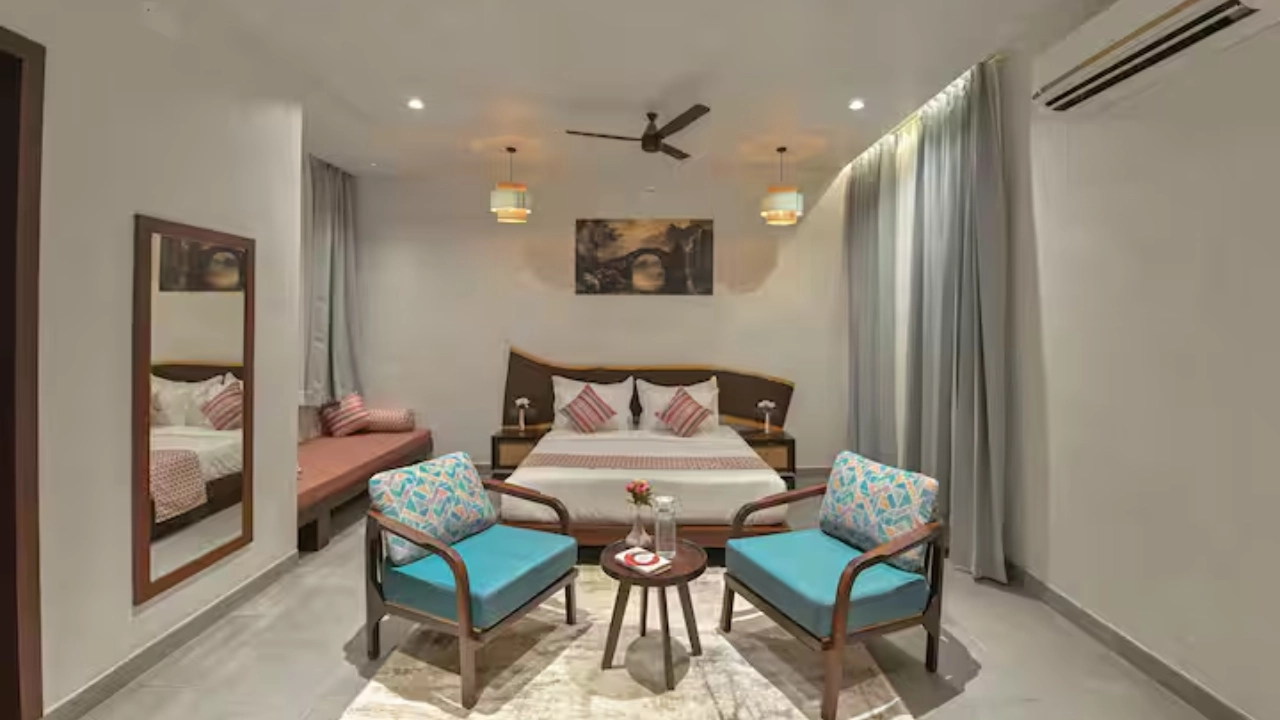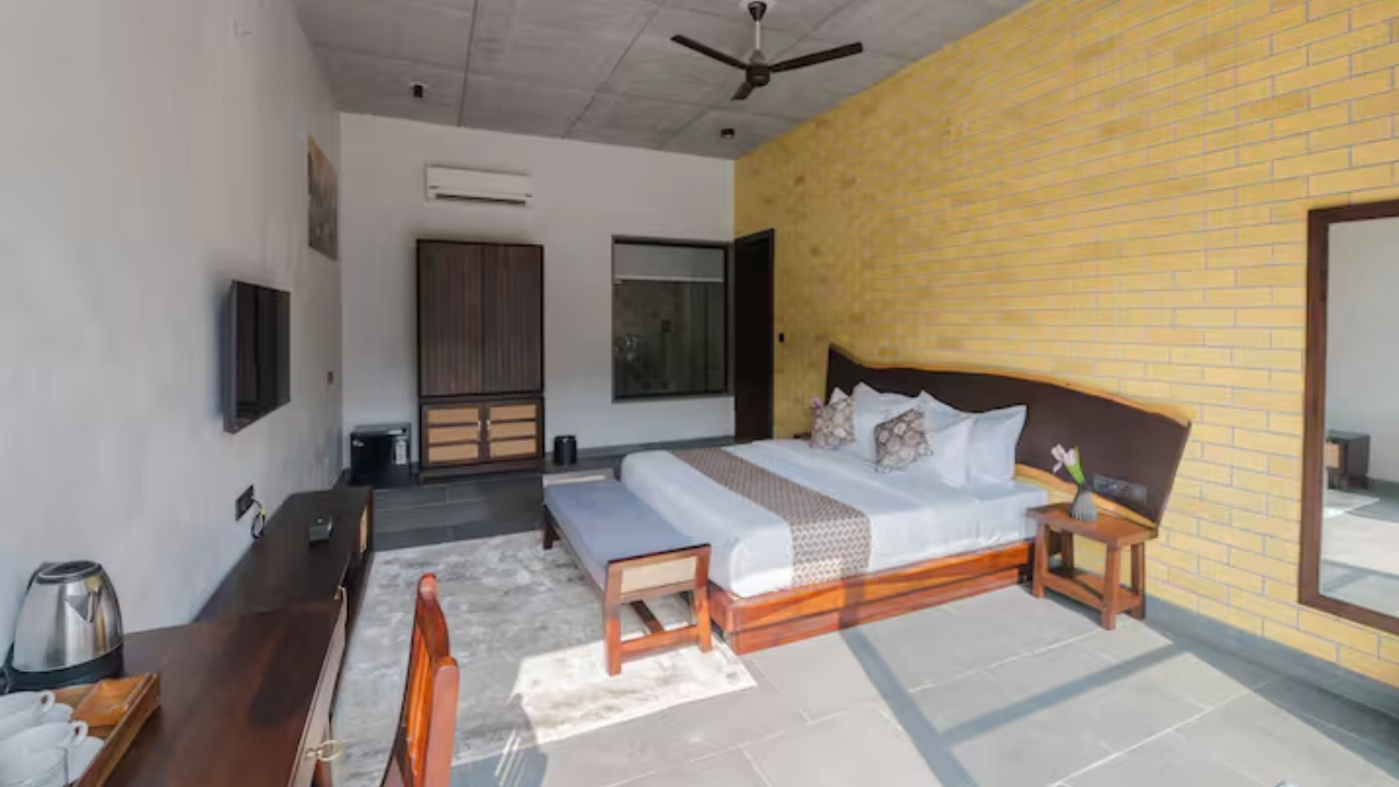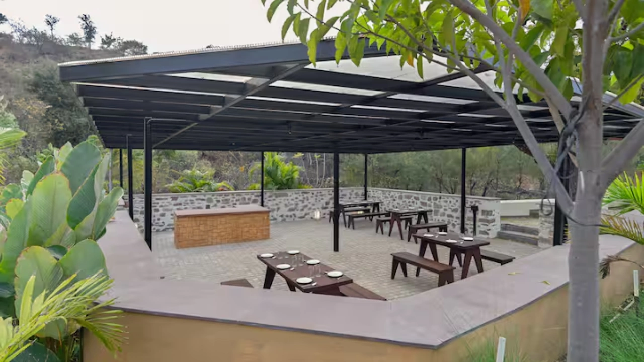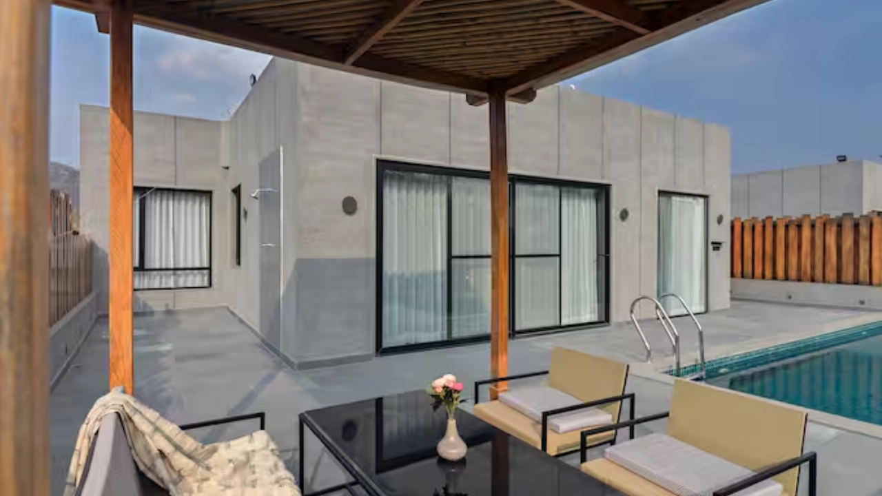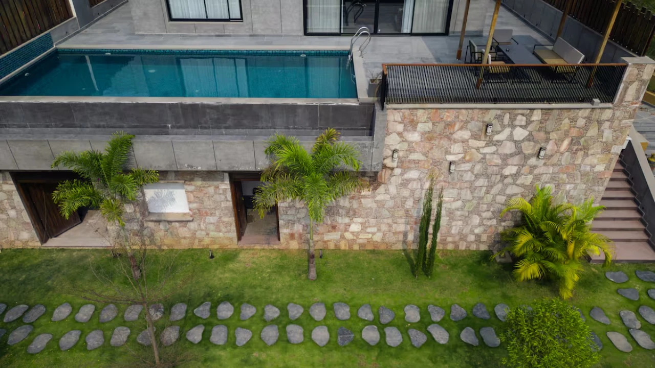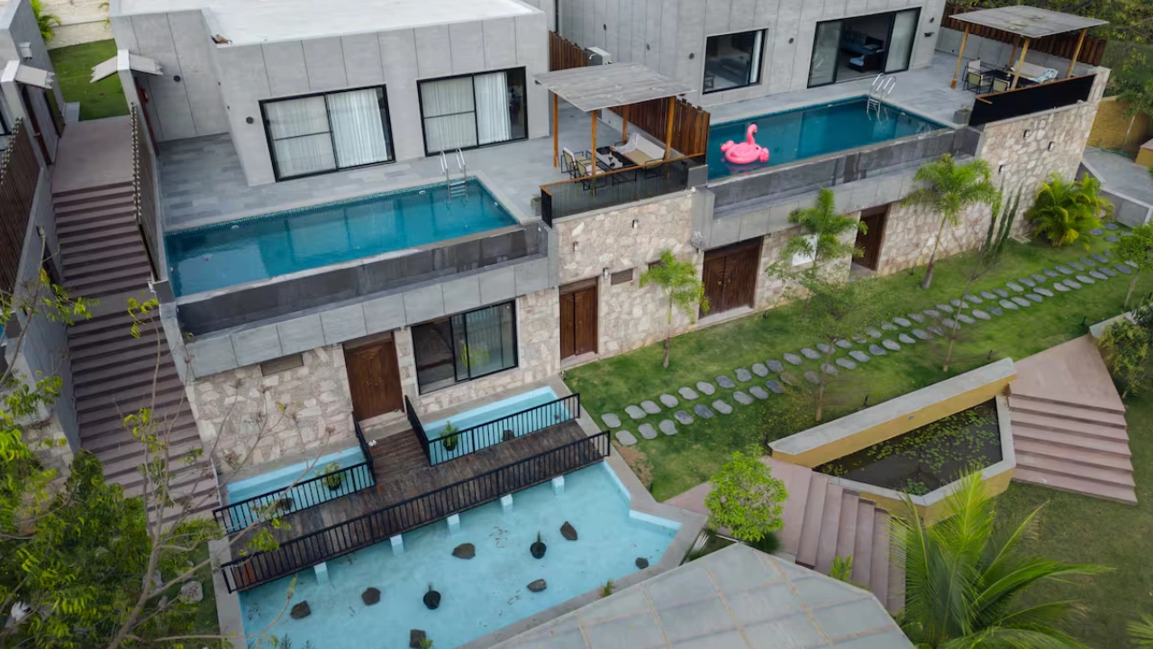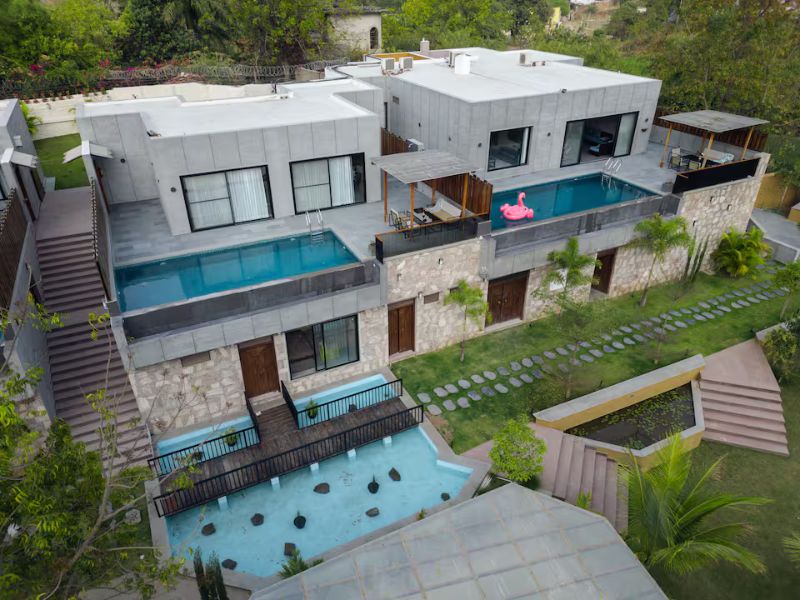 Situated in the embrace of the Aravalli, our 7-BR villa is a micro resort ideal for large group of 20. Spread across 3 independent units, each villa features its own private swimming pool with a gazebo, offering guests the freedom to enjoy privacy. 2 of the 3 units include spacious living areas. Each bedroom comes with attached bathrooms that provide indulgent bathing experience. There are two open-air tubs and 1 enclosed & 2 outdoor showers that bring a resort-like feel to your stay.