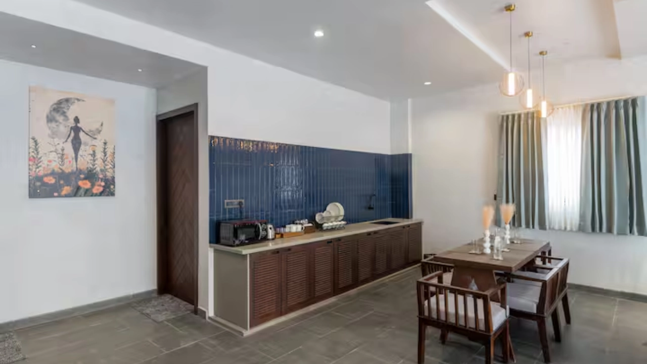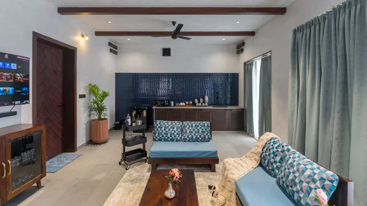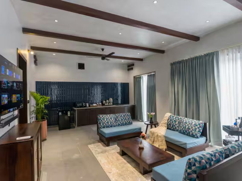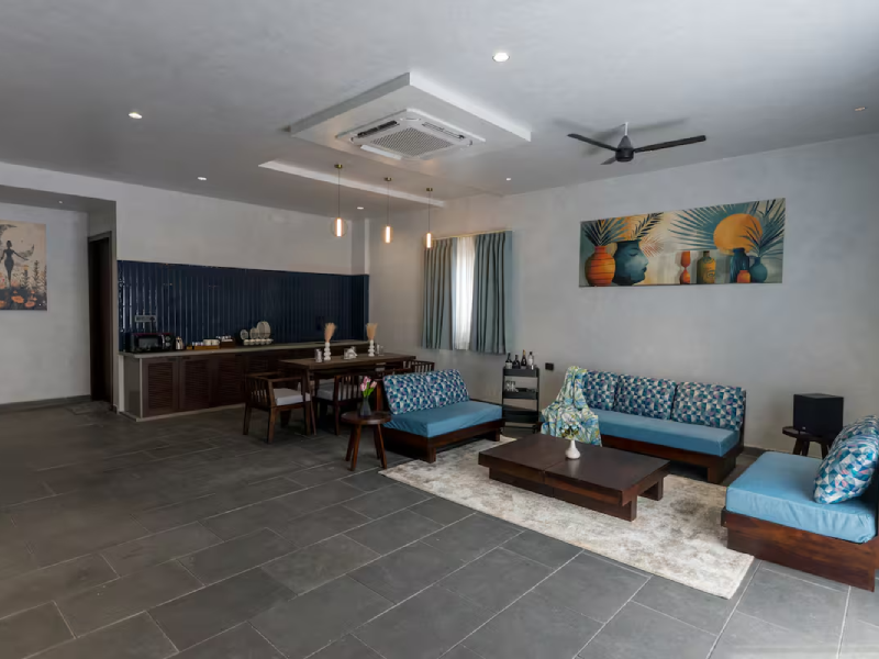 Perfect for a group of 6, our 3-BR villa has 3 bedrooms with king-size beds along with attached bathrooms. It also includes 2 outdoor bathtubs for an open-air resort-like bathing experience along with a separate shower area. It also features a huge living area with adequate sofa seating, smart TV, a sound-bar, a dining space and a kitchenette equipped with a microwave and a bar trolley. Your private pool with gazebo seating offers the perfect spot for a summer dip in complete privacy.